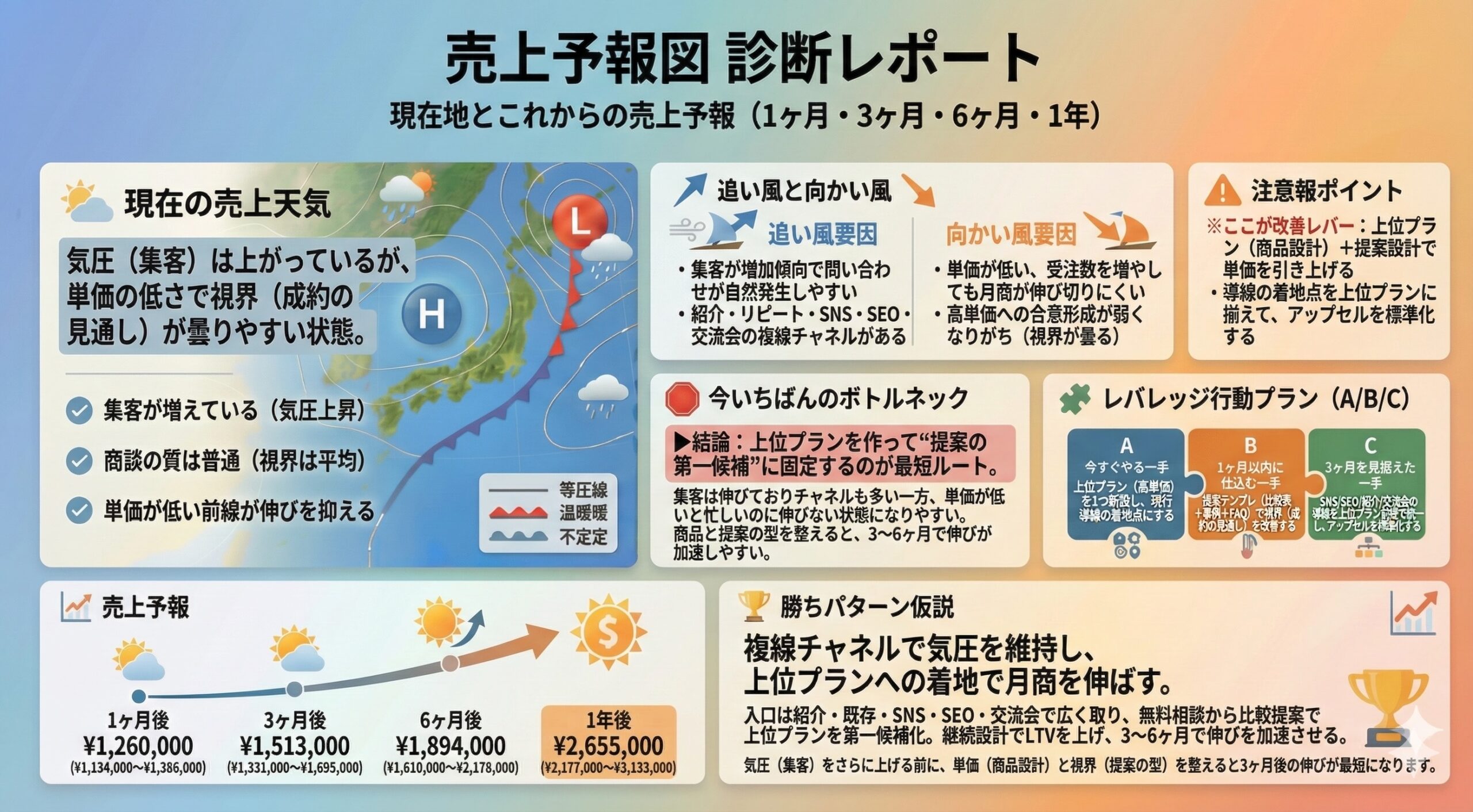 重要:気圧(集客)は上がっている一方、視界(商談〜成約の見通し)が「単価の低さ」で曇りやすい状態です。